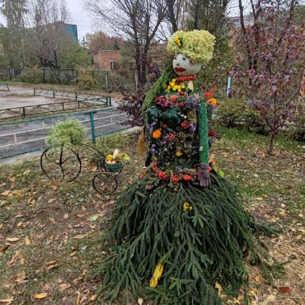 В ТОС «Заозёрный-7» жители свою ростовую куклу изготовили из прочного металлического каркаса, одели её в осенний наряд декорированный листьями.