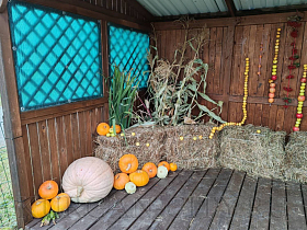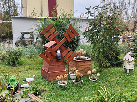 Удивил конкурсную комиссию ТОС «Радужный поселок» и их «Королева Осени». Кукла располагается на территории детской площадки микрорайона Радужный, имеет оригинальную трёхъярусную юбку, изготовленную из кругов фанеры и декорированную тыквой, яблоками, кабачками, арбузом и др. На веранде жители подготовили осеннюю фотозону, её декор выполнен из сена, тыкв и других природных материалов. Также жители ТОС «Радужный поселок» на территории детской площадки обустроили декоративный водоем, установили мостик с черепашкой, а для отдыха приобрели два кресла-кокона на подставке.