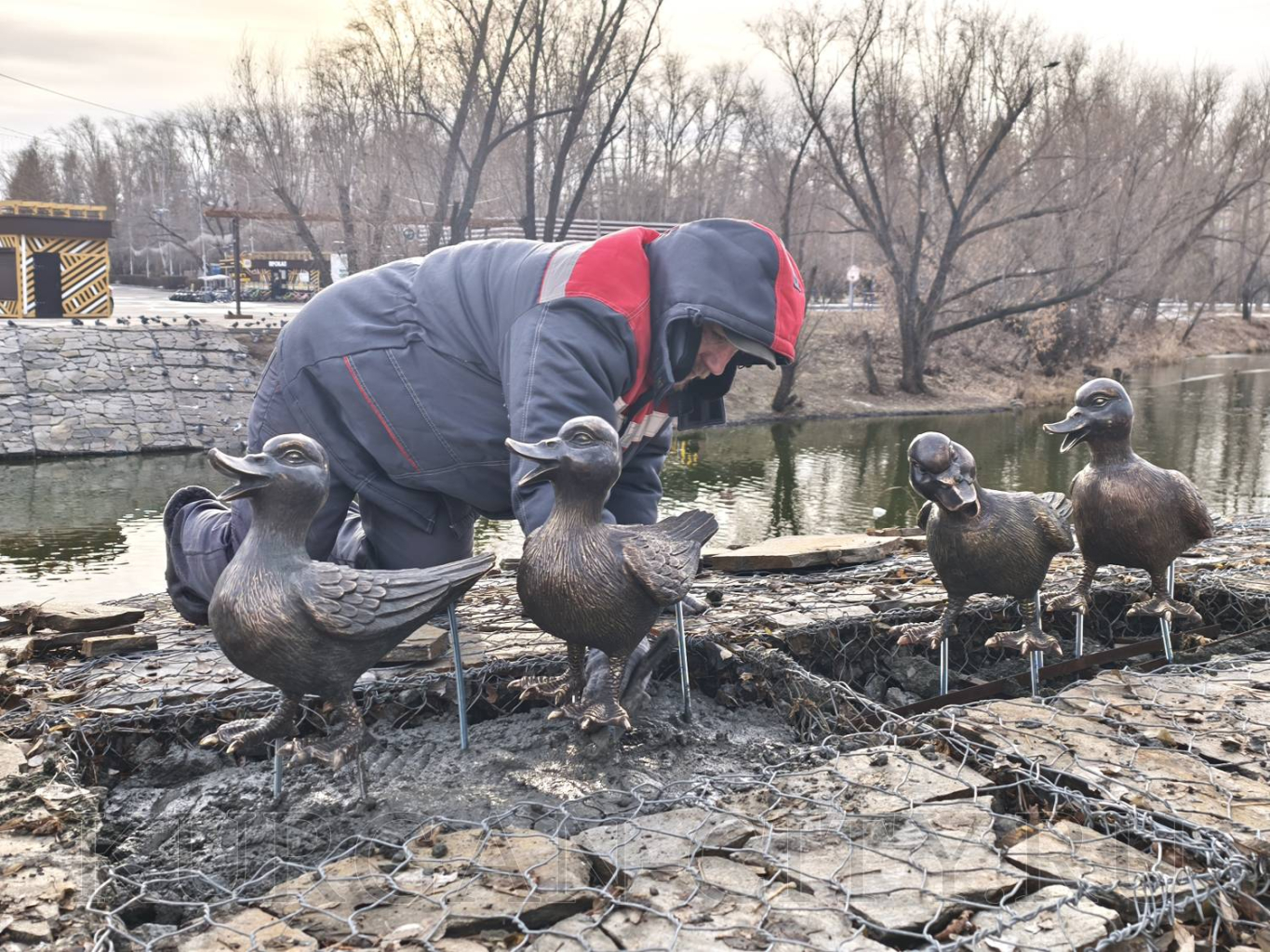 - Мы решили поддержать эту тему. Сначала установили на берегу домики для уток. Затем на входе в парк у нас появилась одна большая мама утка. А сегодня к нам прилетела целая утиная стая. Это четверо маленьких утят. Они все разнохарактерные и веселые, с хорошим позитивным настроением будут встречать гостей нашего парка, жителей нашего города», - рассказала Алла Мирская.